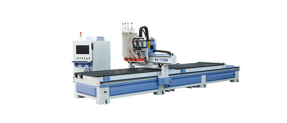 以K4-1228D為例,這款機型是四工序的雙工位開料機,這款機器是專為板式開料設計,可兼容任意拆單軟件,具有0秒換刀設計,可兼容任意拆單軟件,0秒換刀設計,可提高加工效率約15%,雙定位系統,加工不同規格板材一鍵切換,智能智造端口口,可對接生產線;無線操作手輪,操作設備無局限性;雙工位循環加工,較單工位效率提升30%雙工位的顯著特點就是提高了生產效率,雙工位開料機可以充分利用工人,一個臺面加工完成會再另一個臺面上進行加工,對人工的要求大一些但可以多加工幾張板材,如果人員配備不足,可選擇自動上下料,節省人工。