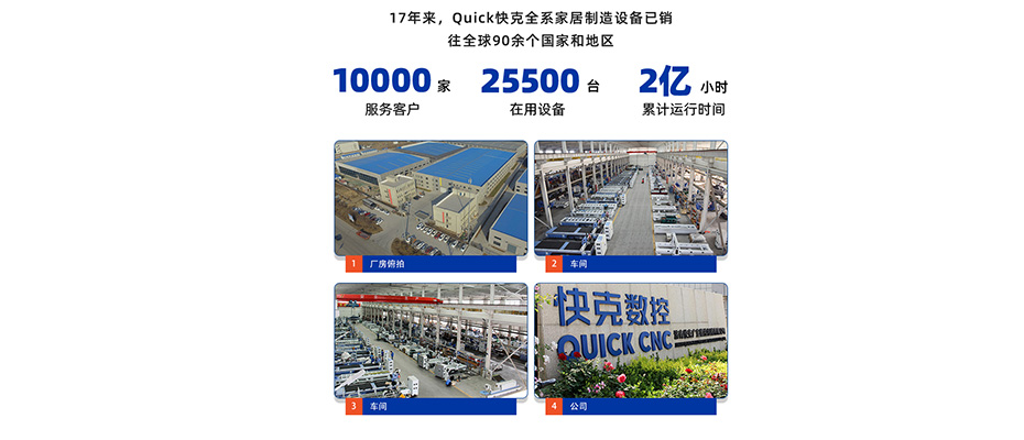 濟南快克數(shù)控成立于2005年,在這個行業(yè)也是摸爬滾打了17年,從最開始一批濟南做雕刻機的廠家慢慢發(fā)展為數(shù)控開料機廠家實力品牌。最初,并沒有數(shù)控開料機這個名詞,最初大家做的都是雕刻機,雕刻木頭的,雕刻金屬的,隨著行業(yè)的慢慢細分,有的廠家專注做木材等非金屬的雕刻機,并且在中國房地產(chǎn)飛速發(fā)展的幾年,裝修行業(yè)的全屋定制也是飛速發(fā)展,快克作為數(shù)控開料機廠家,一直秉承用匠心鑄就品質(zhì),以品質(zhì)成就耐用的理念,做高品質(zhì)數(shù)控設(shè)備,耐用是我們的基因, 時間見證品質(zhì),公司秉承“用匠心鑄就品質(zhì) 以品質(zhì)成就耐用”的生產(chǎn)理念。16年來,Quick快克全系家居制造設(shè)備已銷往全球90余個國家和地區(qū),服務(wù)超10000家客戶,在用設(shè)備超25500臺,累計運行時間超200000000小時。克數(shù)控非常重視技術(shù)創(chuàng)新,在發(fā)展自主研發(fā)、創(chuàng)新產(chǎn)品的同時,充分借鑒國內(nèi)外企業(yè)的先進技術(shù)和經(jīng)營理念,致力于為合作伙伴提供更加優(yōu)質(zhì)的解決方案,以優(yōu)質(zhì)的產(chǎn)品助力合作伙伴搶占市場先機!